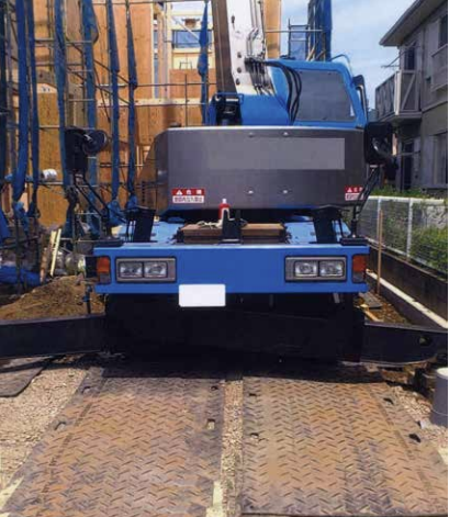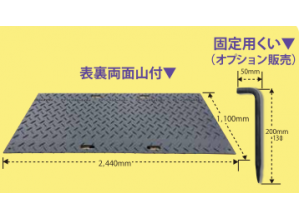 グランドマットはポリエチレン製敷き板である。敷鉄板より軽量で、工事現場等の未舗装の場所に 敷くことで、作業の効率化・臨時車道の確保・現場の美化に役立つ。 敷設可能場所は、土、砂、芝生など様々なコンディションで利用できる。