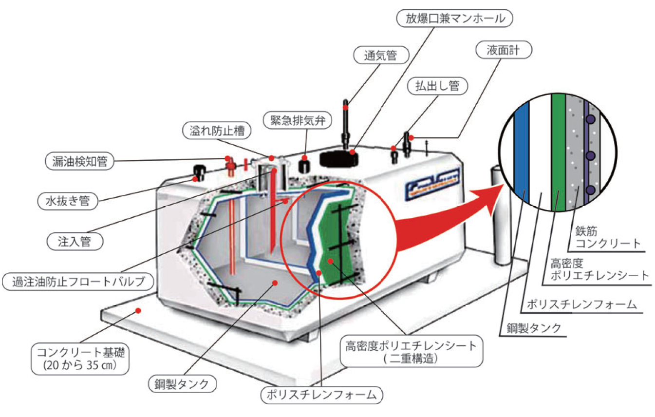 従来型タンクに比べて、安全性と環境にやさしい堅固な構造基盤の上に、納期・保全性・利便性に利点がある。外部衝撃、耐火性及び外部環境に対する保護機能が格段に優れている。