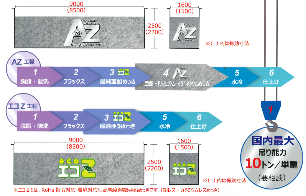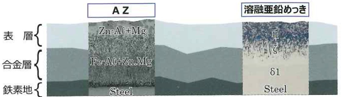1.三元系の合金めっきであるAZは、腐食環境の厳しい地域などで高耐食性が認められ、亜鉛めっきの5倍以上の耐食性が促進試験(5000時間以上)でも認められた次世代の環境対応めっき。