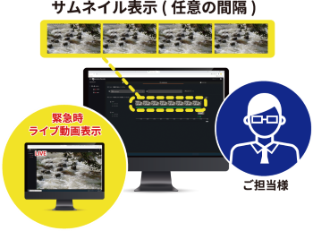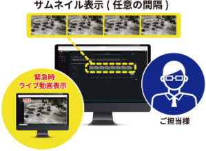 インターネット接続により、管理者のパソコンやスマホの画面にて、定期的にサムネイル画像やライブ動画を確認。