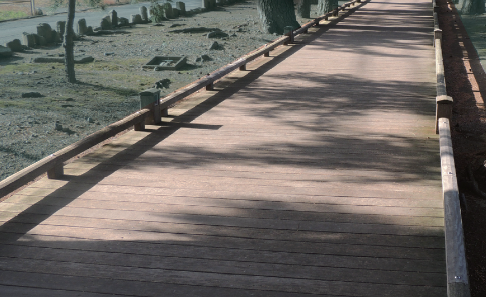 天然木材そのままに、薬剤処理や塗装をせずとも屋外で50~100年保つ高耐久・長寿命。高密度で水を含みにくいため耐腐朽性に優れており、水辺の景観づくりにも最適である。