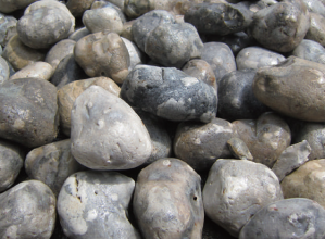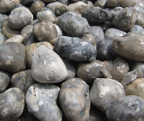 白亜紀のチョーク断層でできた団塊状チャート(フレンチコブル)をフランスの河川にて手作業で採取、選別を行っている。チャートの魅力は、濡れ色による変化が美しく、滑らかテクスチャーと長い年月をかけて川を転がり下って来たため滑らかな風合いも美しい。