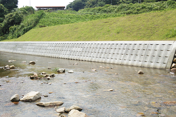 2. 河川の緑化護岸、稚魚や水生昆虫のための生態系護岸を目的とし、河川環境に配慮した環境保全型ブロック。