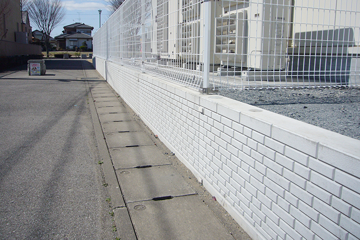 3. 端部用製品を使用することでコーナー部や端部等がキレイに仕上がる。フェンス用の支柱もキレイに設置できる。表面の模様は建物やお庭をより一層引き立てる。