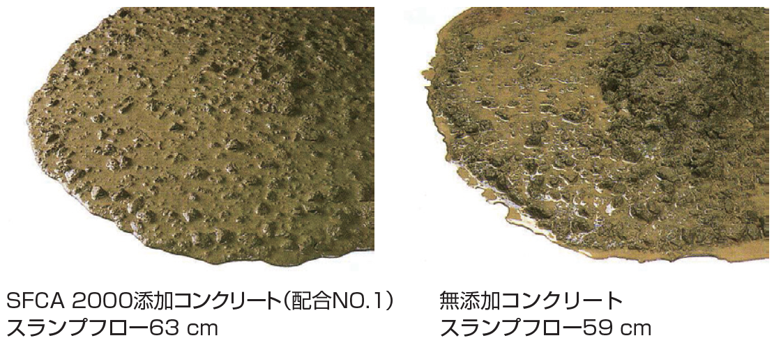 SFCA 2000の増粘作用により、材料分離抵抗性が高まり、骨材分離やブリージングを防止。高炉スラグ微粉末やフライアッシュなど特別な結合材を多量に使用せず、充分な材料分離抵抗性が付与できる。