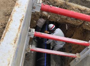 他の管材料と比較して軽量かつ長尺なので、配管作業の省力化、布設重機の小型化が可能であるため、全体的なコストダウンを図ることが可能。軽量性は構造物として基礎工の軽減を図り、軟弱地盤での施工性を向上させる。