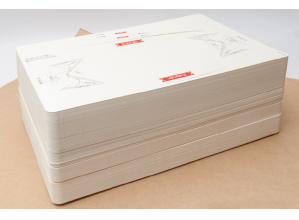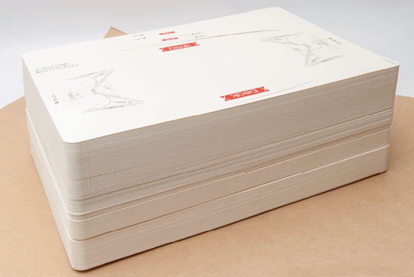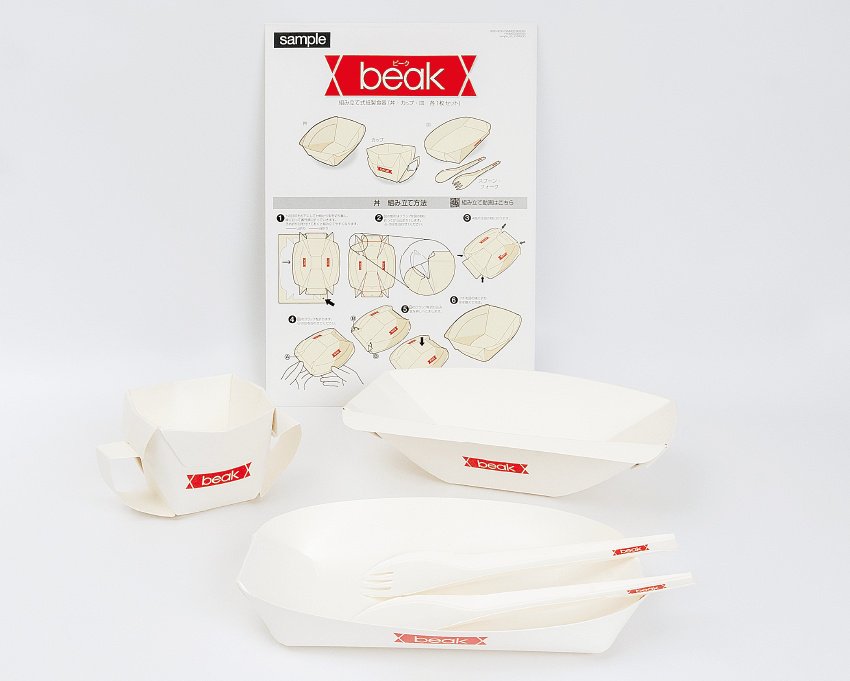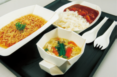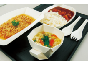 非使用時はシート状でかさばらず、1000人分の食器も厚さ45cm。梱包時の緩衝材も不要で、大量備蓄や搬送性に富むため、防災用品として優れている。カップ、カトラリー付きの皿、丼を考案し、汁物を含むあらゆる料理に適応する容積、強度を持たせた。