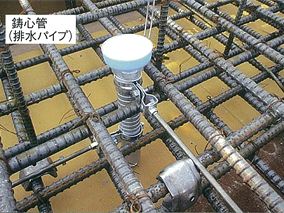 従来の排水パイプ設置工の場合、コンクリート床版の削孔はφ100とφ53の二段径となり、工程・現場作業が煩雑であった。本工法では、削孔はφ53の同一径となり工程が省力化されるほか、以下のような利点がある。