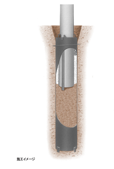 おもに電車線柱に用いられる鋼製基礎で、穴掘建柱車を用いて施工する。電車線に影響を与えない工法で従来工法から大幅に施工時間を短縮させ、コストダウンを実現する画期的な電車線柱用鋼製基礎。 小型汎用重機である穴掘建柱車でポールパイルを地盤にねじこむだけで、簡単・安全に施工が可能。大型作業車やユンボを使う必要はない。機械力施工のため施工時間が従来工法と比べ、大幅に短縮化できる。また、電柱吊りバンドにより電車線柱を短尺化できる。