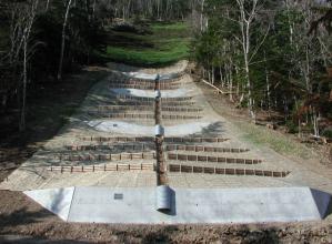 ・ワラゴモに、鉄線入り植生基材袋と金網を装着した多重構造で、積雪・凍上に強い。