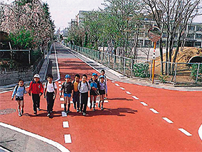 高耐久な水性カラー舗装材 用途:歩車道分離、通学路、自転車道(矢羽)、駐輪場の駐車枠など