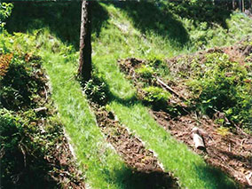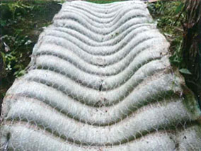 植生基材を封入した厚層タイプの水路用マット。軽量で施工性に優れているため植生土のう水路の代替品として有効である。流水による種子・基盤材の流出を防止する特殊植生帯により、安定した緑化が期待できる。