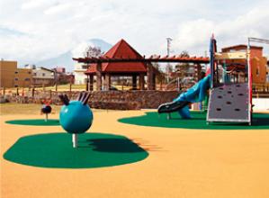 景観に加え、透水性と適度な弾性舗装材で足にやさしく、バリアフリーの仕上げ。本格的な競技場用全天候型弾性舗装から、エコマーク製品にも対応。 月平均生産量:400トン