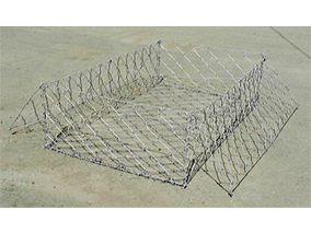 3.中詰材に砕石などが使用できる、補強タイプ(特注品)も製作可能。基本型は中詰材を玉石、割石とするが、補強タイプを使用することにより、内張シートを併用し安価な砕石などを使用することができる。かごの構造を補強、枠線、および吊線を追加しかごの変形を防止する。