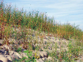 緩勾配タイプの大型連節(結)護岸ブロック。緑化に重点を置いた環境保全型の製品で、自然な河川環境を創出。