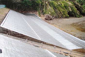 この工法は、大型の重機などを使用せずに、パネルを人力運搬-敷均-接着工程により短期間に水密性の高い防水層を作ることが可能である。パネル自体のタワミ性が大きいため、基盤沈下が予想される所でも使用できる。ため池改修事業などの、中規模の貯水池の使用例が多いが、遮水面積が50,000m2クラスの施工例もある。また最近は、親水護岸、水路やレジャーランドの園内池、処分場など多方面に使用されている。