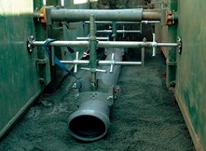 下水道工事において埋め戻しまでの仮固定をする管布設補助具で管の勾配と方向をミリ単位の微調整が出来る機能及び浮き上がり防止機能を備えている。