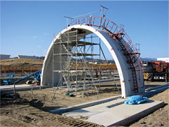 PC-ATM(Pre-Cast Arch Tunnel Method)とは、トンネル横断方向で2分割された円弧状のプレキャストコンクリート版を、あらかじめ構築された基礎の上にトンネル横断方向に対して左右交互に設置していき、その周辺の盛土施工を行いトンネルを構築する工法である。 NETISプラス登録番号 AC-150007-P