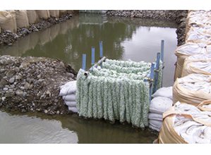 ひも状ろ過材を用いて現場打ち水路や側溝内等で土粒子を捕捉する技術。簡単な施工で土粒子流出量が大幅に減少し、重機や濁水処理設備が不要。