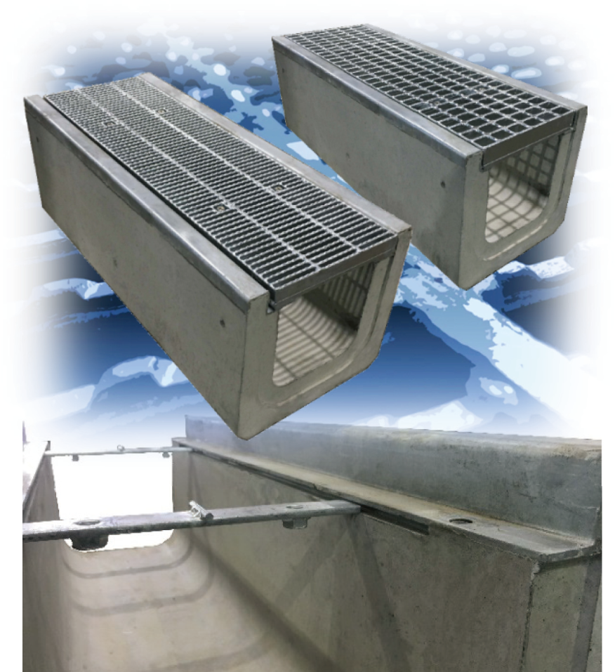 ハイテン鋼製の鋼製排水溝。通水断面が広く省スペースでも高い排水能力を発揮する。