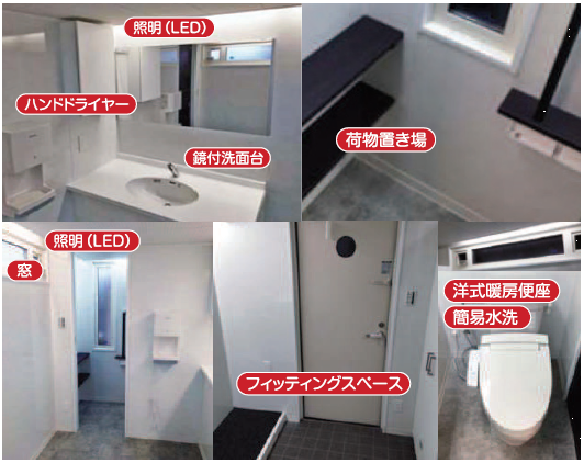 ・仮設ハウスのイメージを変える高級感のある内外装と諸設備(特注ドレッサー・自動水栓・電気ポンプ・ハンドドライヤー) ・LED照明で省電力化。(ソーラー電源供給も相談可) ・機械式強制換気(臭気排気ファン併用)で室内への臭気逆流対策も十分考慮されている。