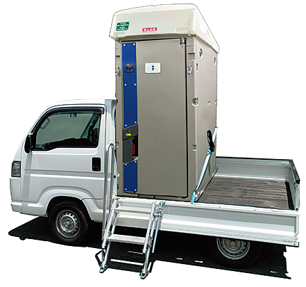 清潔と快適にこだわった移動式トイレユニットで、建設現場用を開発した。4t級のクレーン付きトラッ...
