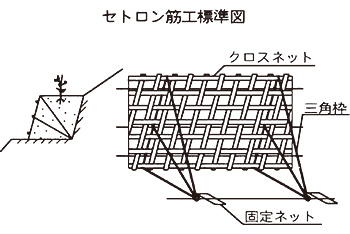 山腹表土の滑落防止、緑化目的で施工する製品であり、特殊鋼線で構成した三角枠を使用することにより、杭の打てない場所での施工に好適であり、杭のいらない緑化土留として治山事業に多用されている。