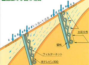 のり表面の水抜き効果が抜群のため、特にエロージョン(浸食)防止に威力を発揮する。土留柵体は、断面係数が大きく留杭部でも、その中間部でも均等な対応力がある。土留柵体と留杭は一体となって各段ごとに土圧を支持。さらに水抜き土留効果により、のり面全体を一体化することによってのり面崩壊を防止する。のり内部の水抜きで安定した表層が得られるため、押え盛土的効果がある。地中に埋設する工法のため、緑化による自然景観が得られる。