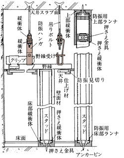 ハンガやランナ下部に特殊弾性樹脂をかませ、天井・壁の振動を吸収し防振効果を発揮する。