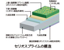 塗装用原板に亜鉛めっき鋼板の4倍の耐食性を有する溶融55%アルミニウム-亜鉛合金めっき鋼板(ガルバスター)を使用。上塗りにはポリエステル樹脂系塗料を用い、2度塗り2度焼付し、優れた耐久性を有する。