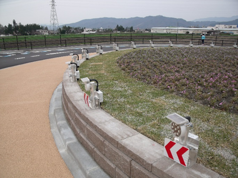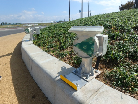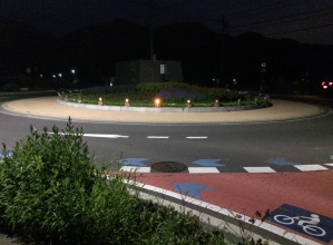 ・等間隔で設置された発光ユニットが発光することで、中央に円形の島部がある環状交差点であることを知らせる。