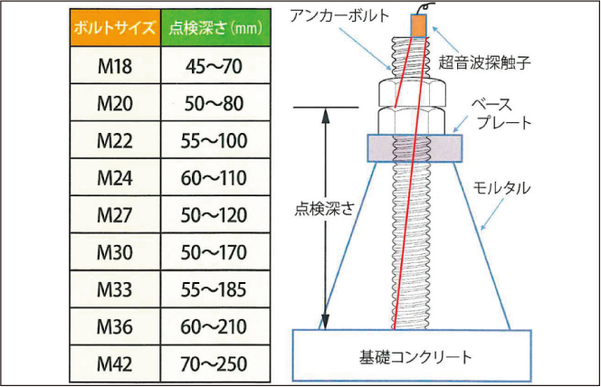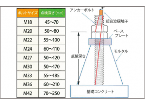埋設されたアンカーボルトについて、ねじ山の欠損やボルトの亀裂を超音波により点検・検出するシステム
