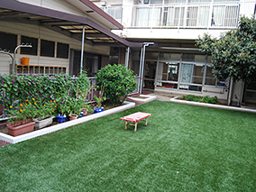 ・ゴム枠の角は丸みを帯びており、またその丸みは左右で角度が違うため、砂場の内側と外側を選んで設置することができる。